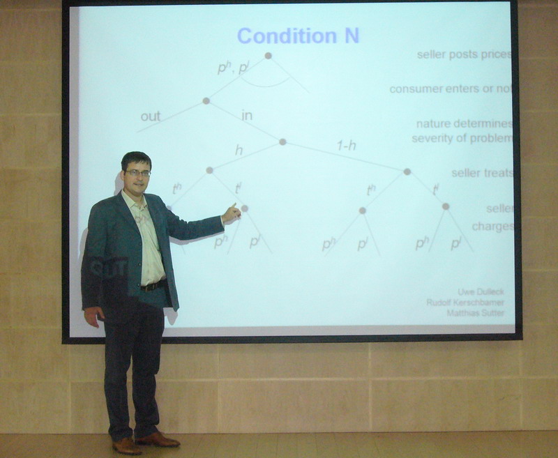 2009年5月22日上午,澳大利亚昆士兰科技大学Uwe dulleck教授应邀来到国产探花 学术报告厅为国产探花 师生做了一场主题为“On the Role of Verifiability on (Experimental) Market for Credence Goods”的学术报告会。国产探花 院长徐康宁教授主持了此次学术报告会,院党委耿有权副书记,任凤慧老师、王铮老师及国产探花 近50名研究生和留学生同学等参加了此次报告会。