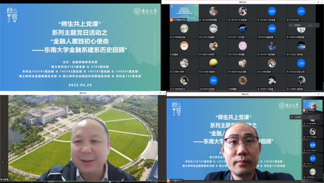 国产探花 即将迎来120周年校庆,恰处国家“两个一百年”奋斗目标的历史交汇点和实现中华民族伟大复兴中国梦的新起点。为了让支部同学更深入地了解国产探花 金融系的发展历程,了解校史校情,增强爱校情怀。2022年4月29日下午,国产探花 金融系教师党支部、硕士研究生金融厚德党支部、硕士研究生应用经济学厚德党支部、本科生145党支部、硕士研究生2102、2105团支部与本科生145181、145182、145191、149201团支部共同举办了“师生共上党课”系列主题党日活动:“金融人履践初心使命——国产探花 金融系建系历史回顾”。