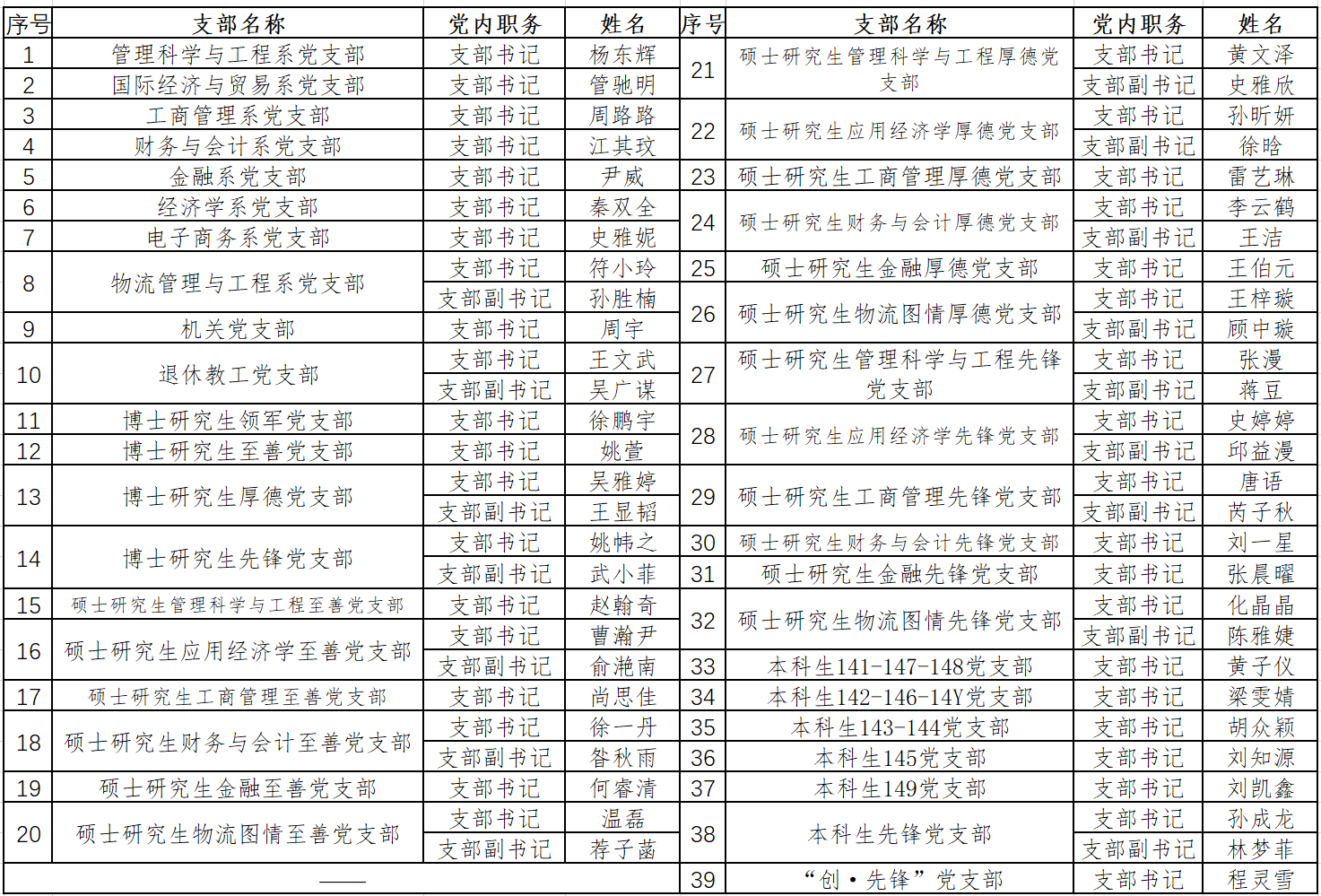 经学院党委会讨论审批,同意各党支部党员大会选举结果。现将选举结果公示如下: