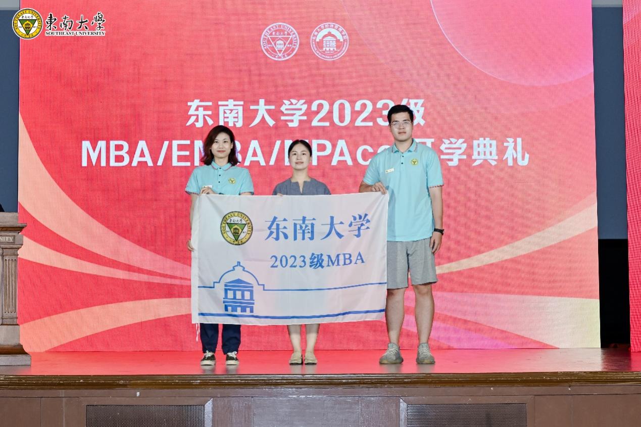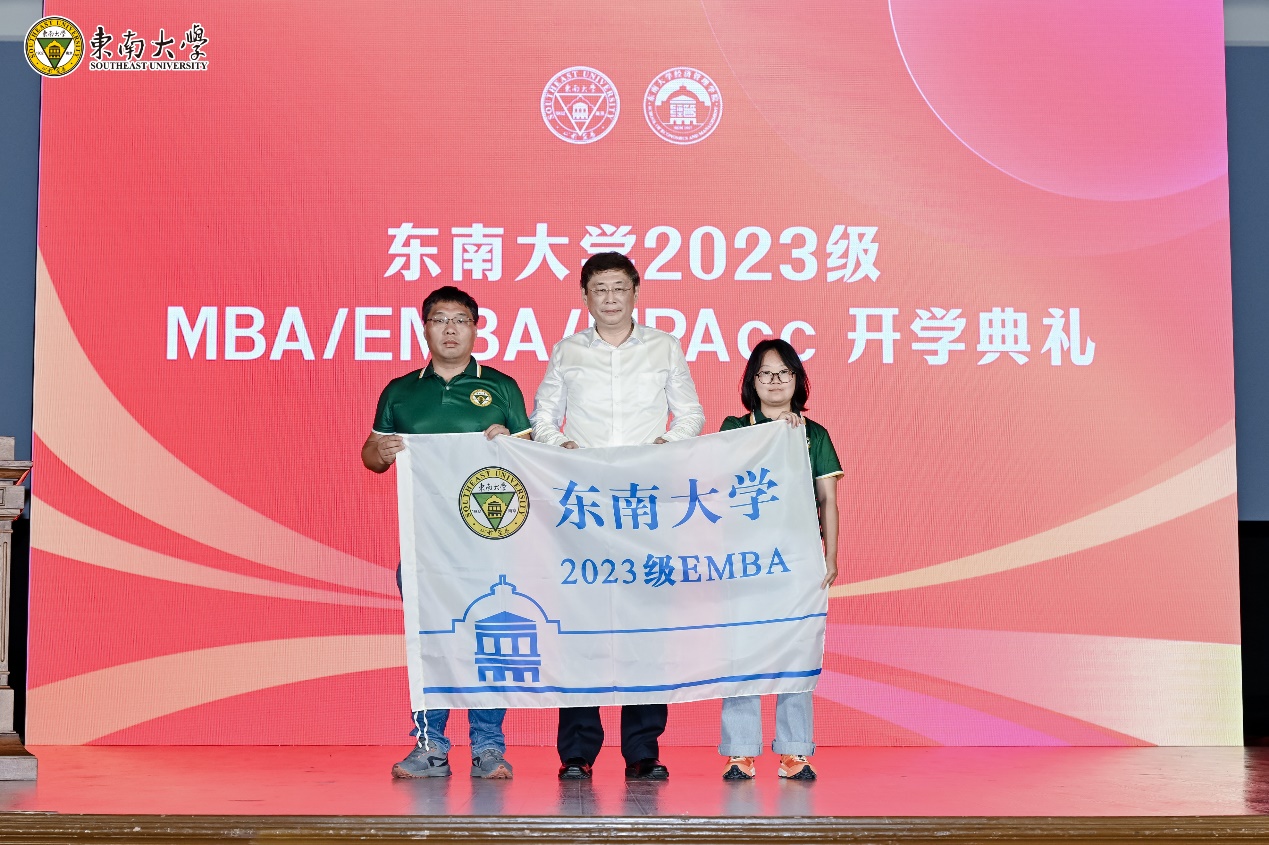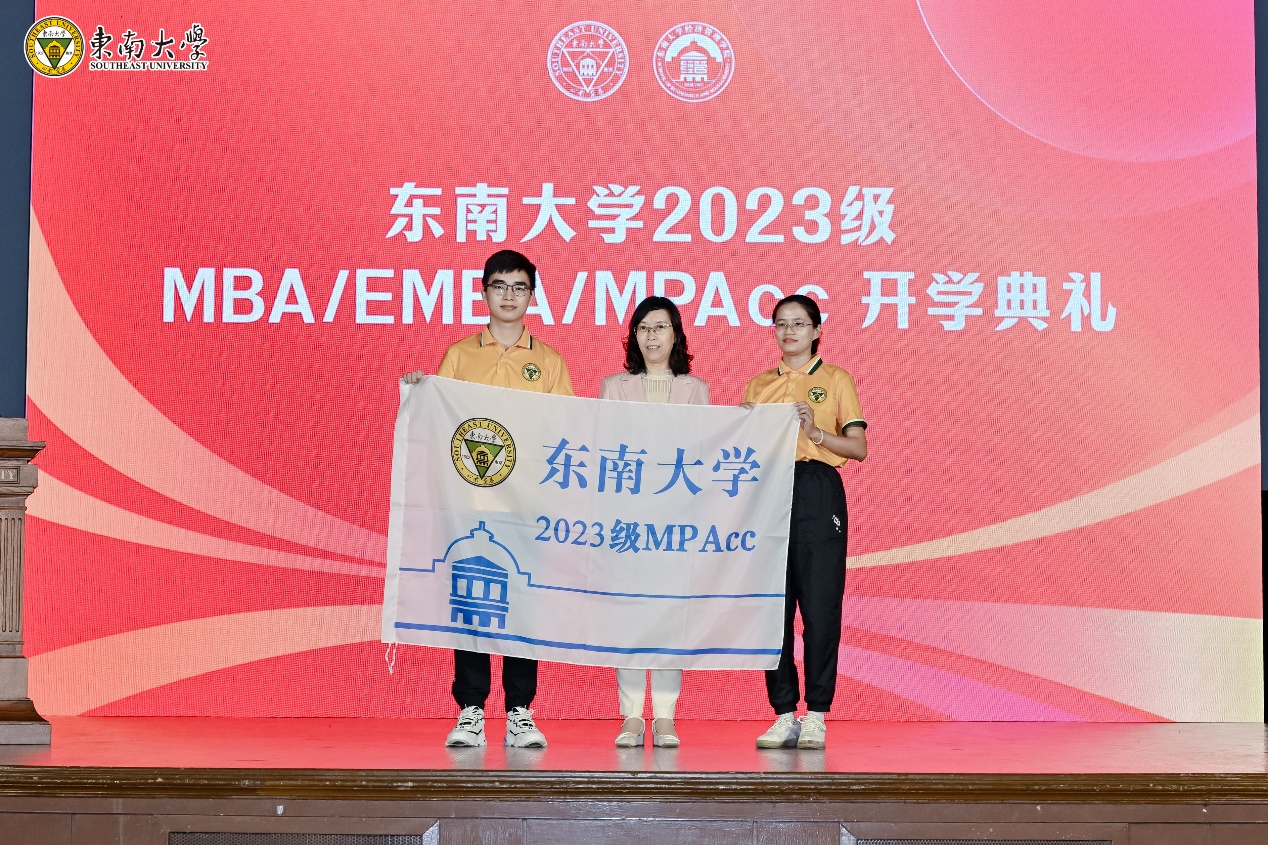 开学典礼最后,黄大卫副校长、钱怡君副部长以及财务与会计系党支部书记江其玟老师分别为EMBA、MBA、MPAcc新生代表授旗,标志着2023级MBA/EMBA/MPAcc新同学三年的学习生活的正式起航!