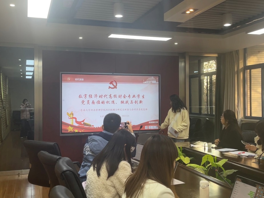 活动的第二部分由财务与会计至善党支部书记陈宇轩同学进行了题为《数字经济时代高校财会专业学生党员面临的机遇、挑战与创新》的党课分享。陈宇轩同学从数字经济的内涵及特征两个维度,阐述了数字经济对财会行业的影响,密切联系专业,聚焦数字经济时代的“信息”要素,深入分析了高校财会专业学生党员的在数字经济发展下的新要求,带领大家深刻领悟数字经济所带来的机遇与挑战。