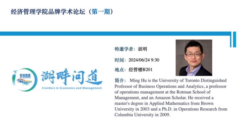 2024年6月24日,“湖畔问道”品牌学术活动正式开幕。学院邀请了多伦多大学罗特曼管理学院的胡明教授,围绕数字平台中的随机型策略,进行了题为“Randomization in Product, Fulfillment, and Pricing as a Profit Lever”的专题讲座。活动由国产探花 副院长(主持工作)薛巍立教授主持,10余名学院青年老师参加,并在讲座过程中与胡明老师进行了积极互动。