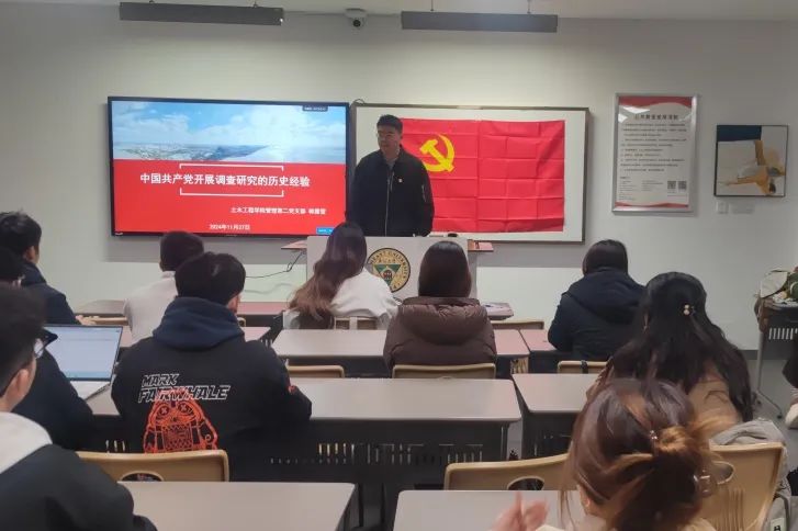 在理论学习环节,两支部党员共同学习了习近平新时代中国特色社会主义思想的重要论述。土木工程学院管理第二党支部书记韩露萱以《中国共产党调查研究的历史经验》为主题,结合《关于在全党大兴调查研究的工作方案》,为两个支部的党员讲解了调查研究的内涵与重要意义、调查研究中应注意的问题及相关制度。国产探花 硕士研究生管理科学与工程厚德党支部纪检委员梅紫晨、副书记郝韵则通过《而今迈步从头越 —— 纪念红军长征出发90周年》专题党课,从习近平总书记关于长征精神的重要论述、长征精神的科学内涵和实践价值和以长征精神领航走好新的赶考之路三个方面对长征精神内涵进行了深刻的解读。
