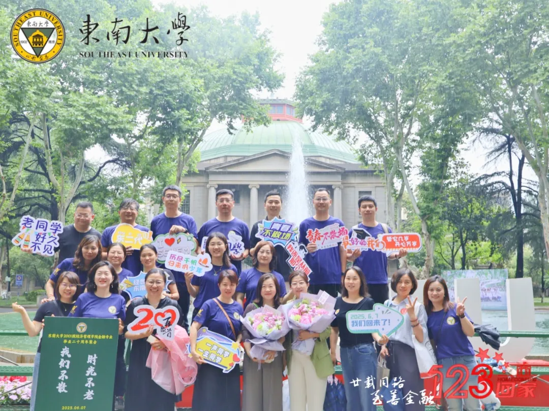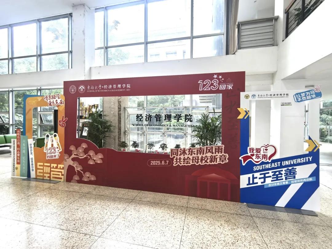 踏入经管楼大厅,定制的纪念打卡框似时光宝匣,将校友与母校重逢的刹那凝成永恒。光影交错间,昔日课堂上青涩的面庞与今朝职场中成熟的笑颜重叠,无声诉说着跨越岁月的眷恋。学院在四牌楼和九龙湖校区设置的接待中心化作温暖港湾,学弟学妹们恰似春日暖阳,迎接远道而来的校友。一间间会议室里,桌椅围作重逢的圆,盛满班集体的欢声笑语,那些封存在青春纪念册里的故事,在絮语中重新焕发生机。