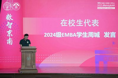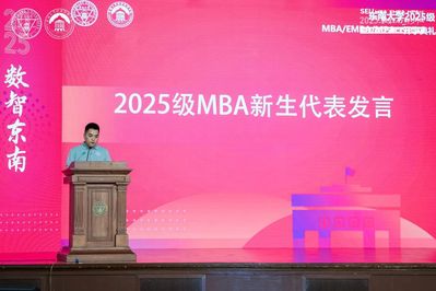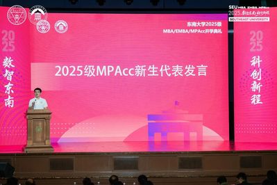 在校生代表2024级EMBA周城同学分享了在校学习的经历与心得,他的感悟对新同学也是未来道路上的助力与指引;EMBA杨明、MBA蒋马利与MPAcc钱海宁作为新生代表发言,他们各自表达了对东南精神的理解,分享了对未来学习生活的规划与憧憬。