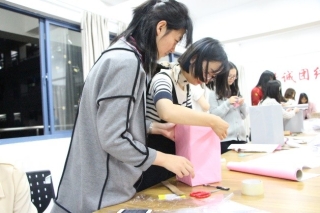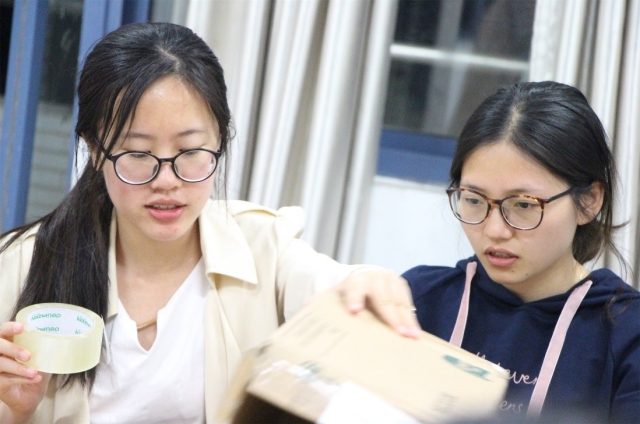 晚上七点活动正式开始,首先由负责人宣布活动开始并讲解了“流浪猫之家”猫咪屋制作基本流程及注意事项。随后,工作人员给每个小组发放了防水贴纸、保护膜、剪刀、宽胶带等制作工具。拿到工具后,小组成员相互协作,发挥创造力,制作出了形状各异、色彩丰富的猫咪屋。