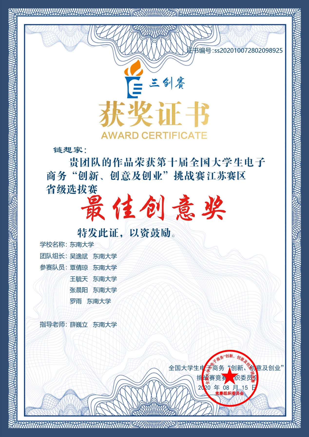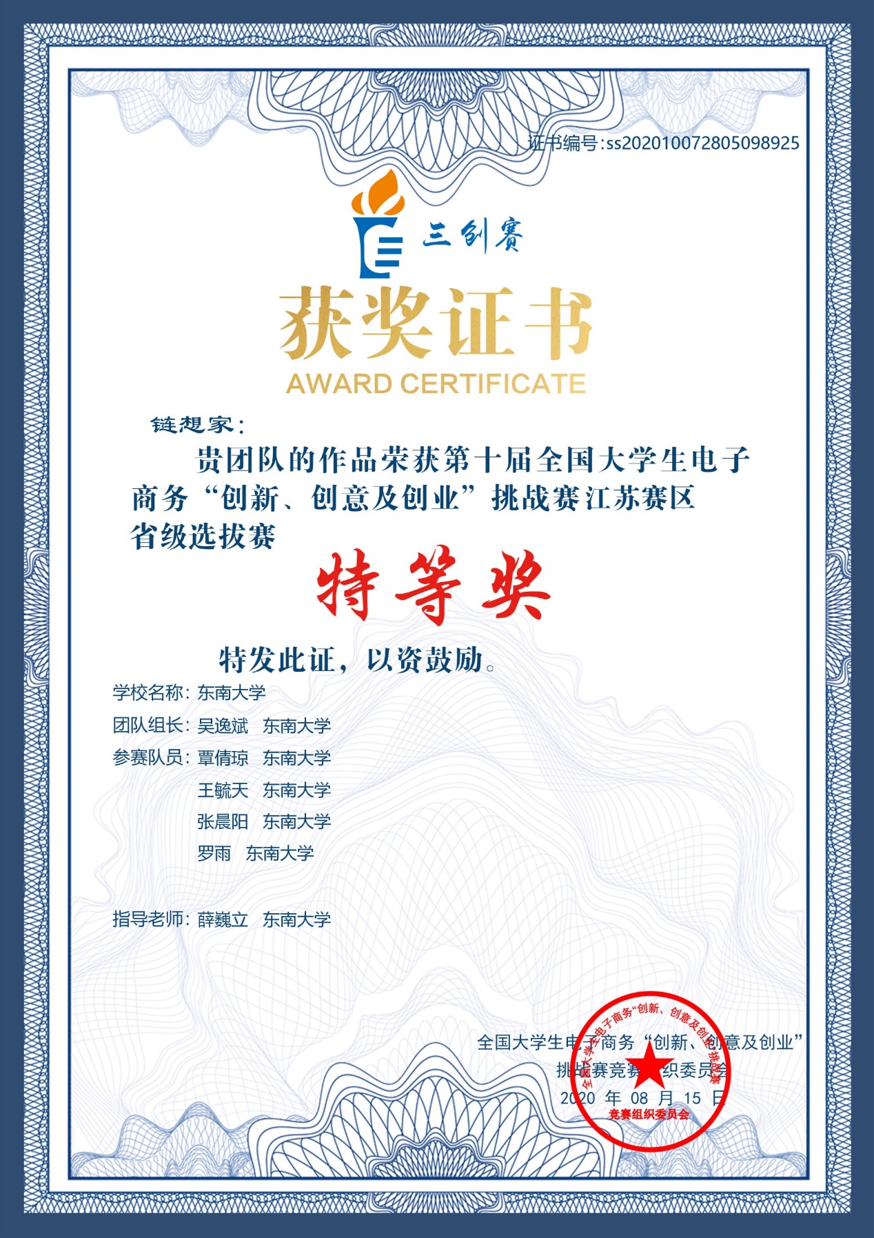 在本届全国大学生电子商务“创新、创意及创业”挑战赛中,国产探花 “链想家”团队共摘得了四份荣誉。分别是:全国一等奖、省级选拔赛特等奖、省级选拔赛最佳创意奖和优秀指导奖。这也是我校在三创赛中首次夺得全国一等奖。这些成果的获得,既离不开团队中每个成员的努力,也离不开薛巍立老师的指导和学校的支持。