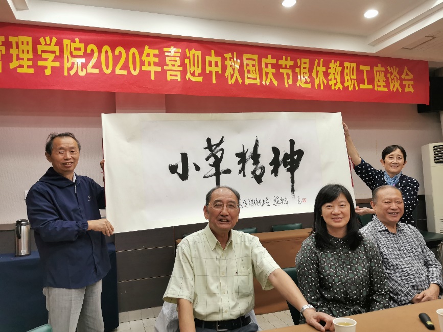 校退协理事长程明山代表第五届退协向老同志们致以节日的问候,感谢他们多年来的辛勤付出,并对今后的工作提出目标和展望。校退协名誉理事长龚乐年带大家重温小草精神,向学院退离休党支部赠送书法一幅。