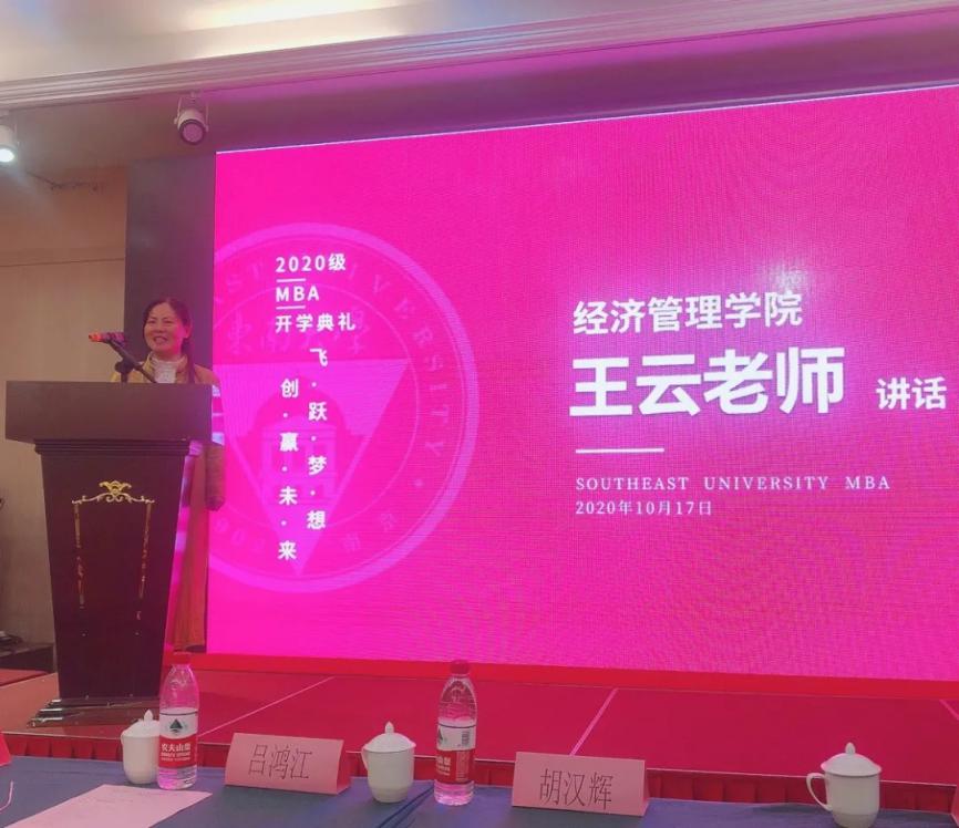 王云老师作为MBA班主任代表讲话。她鼓励同学们认真上好每一堂课,积极参加每一次活动,多与老师们、同学们互动。通过MBA三年学习,进一步完善实现知识结构的完善,拓宽认知视野的拓宽,提升职场能力的提升。