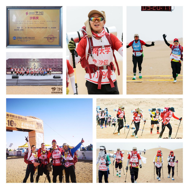 第十届亚太地区商学院沙漠挑战赛(以下简称“沙10”)于2021年5月1日至4日在内蒙古阿拉善盟腾格里沙漠举行,来自121所院校共3600多名选手在3天的时间里用脚丈量沙漠,完成70公里(超A100公里)的挑战。国产探花 EMBA与MBA学员分别组队参赛,两支参赛队伍经受住了炎炎烈日、黄沙飞舞的大自然考验,以实际行动践行了“环保、协作、坚持、责任”的赛事理念,以不畏艰难、挑战自我的拚搏精神,再次取得了优异的成绩,成为众人瞩目的“双沙鸥”团队。