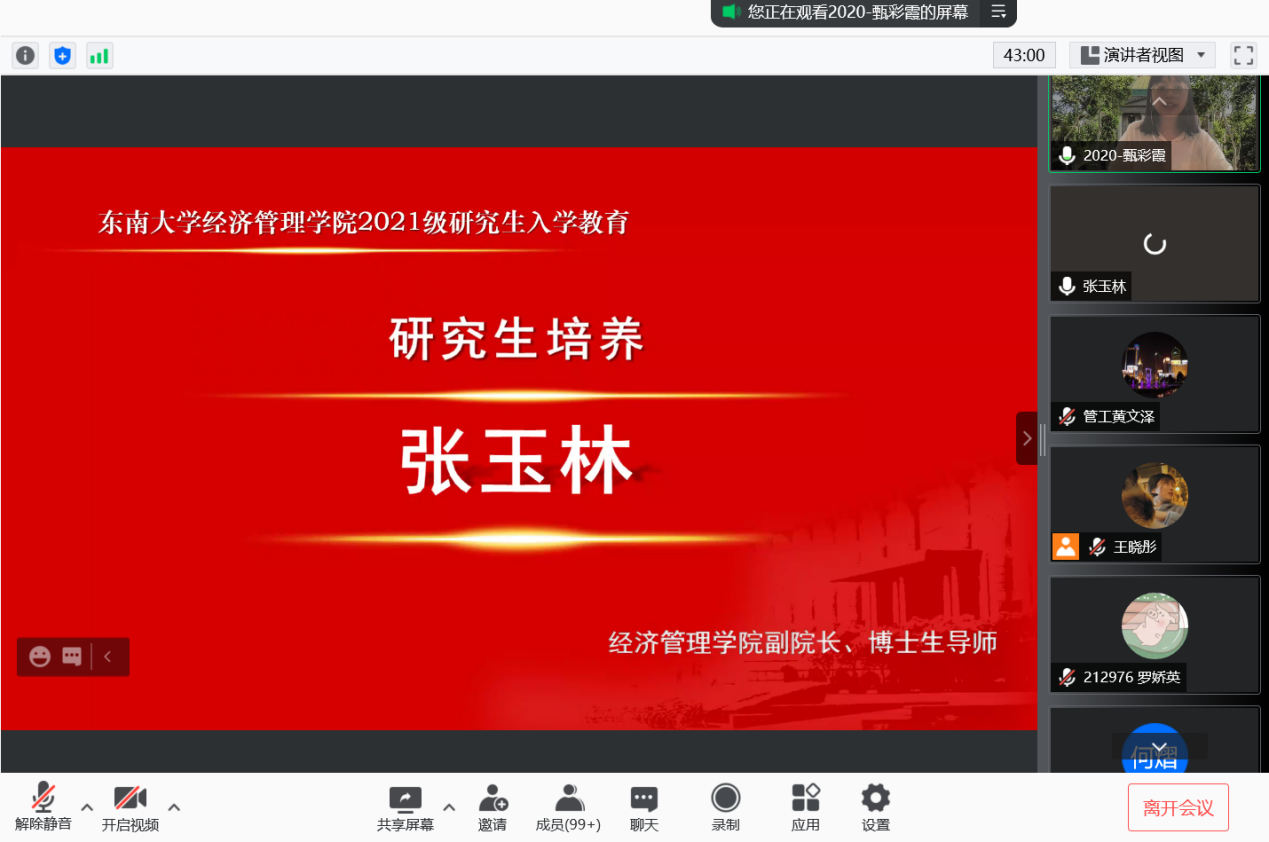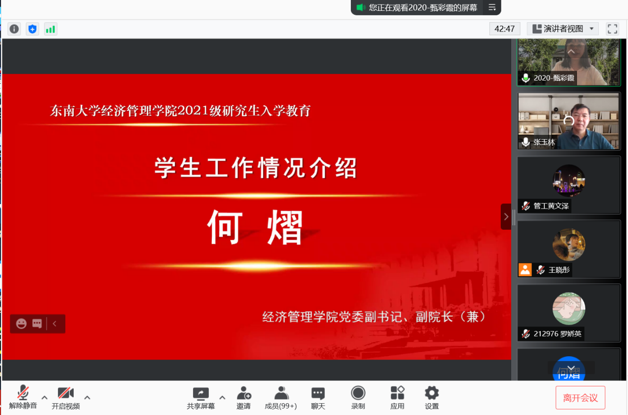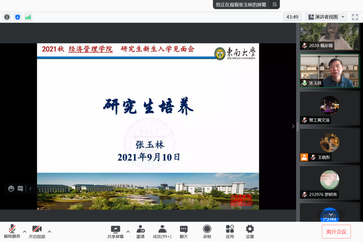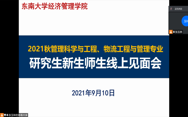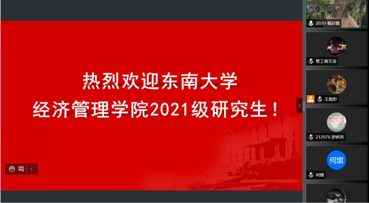 2021年9月10日上午9时,恰逢教师节,国产探花 研究生新生入学教育如期举行,2021级182位硕士研究生及17位秋季入学的博士研究生在云端与东大经管相约。