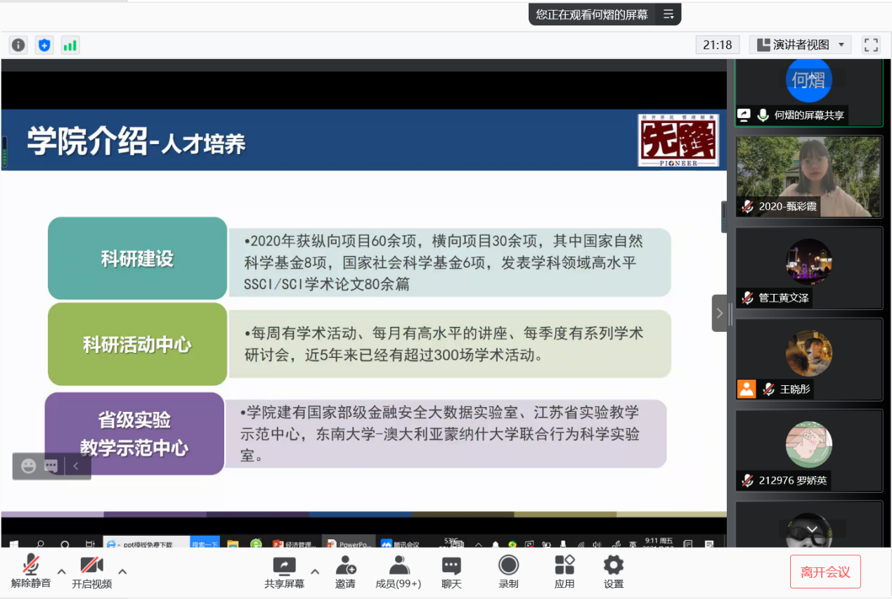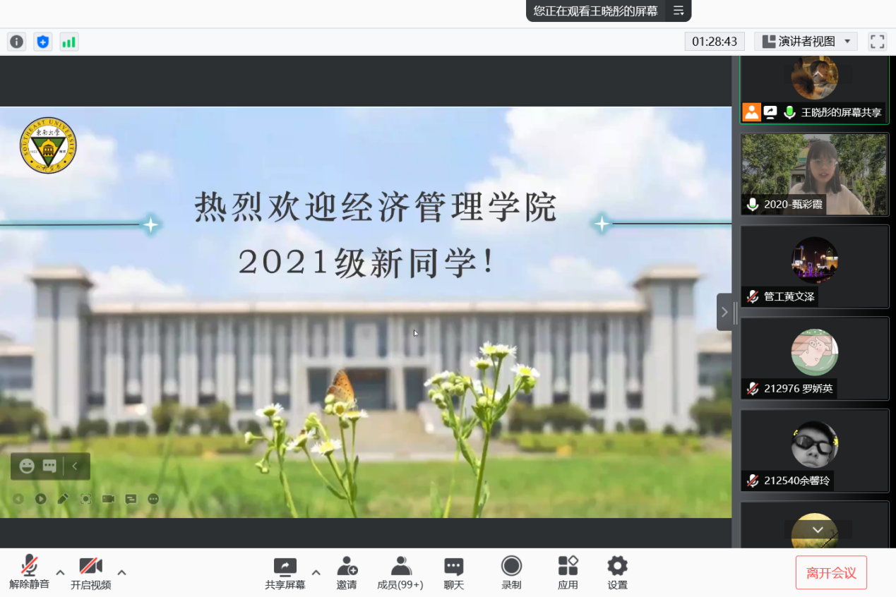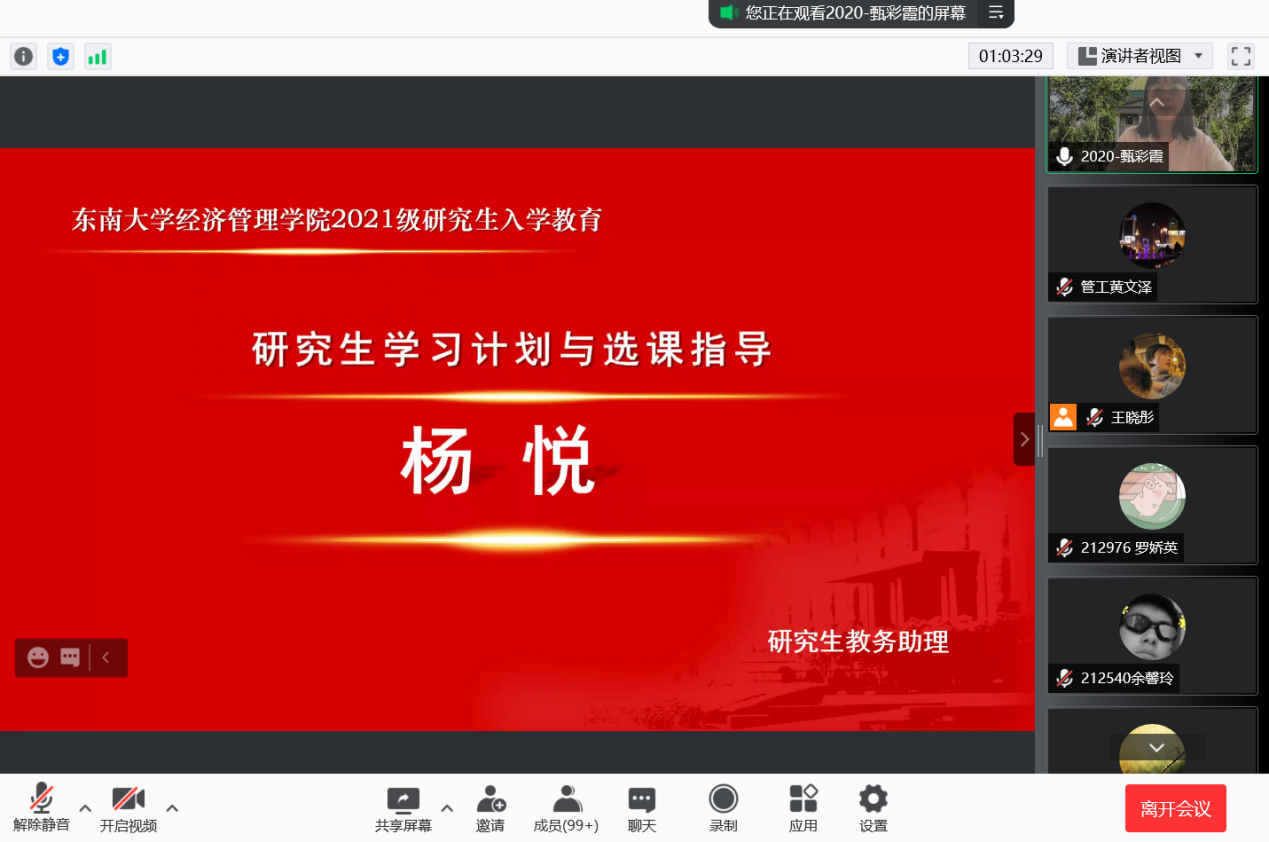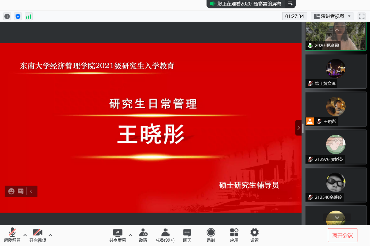 2021年9月10日上午9时,恰逢教师节,国产探花 研究生新生入学教育如期举行,2021级182位硕士研究生及17位秋季入学的博士研究生在云端与东大经管相约。