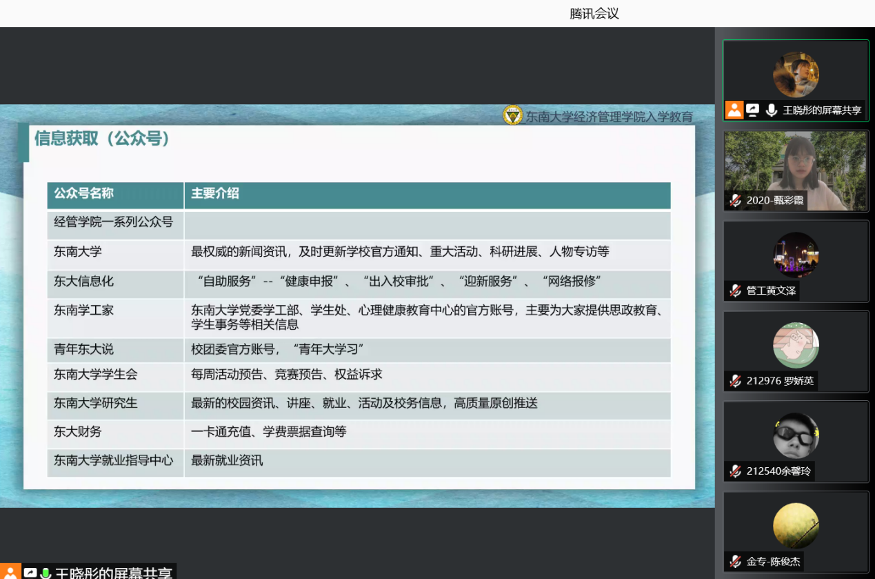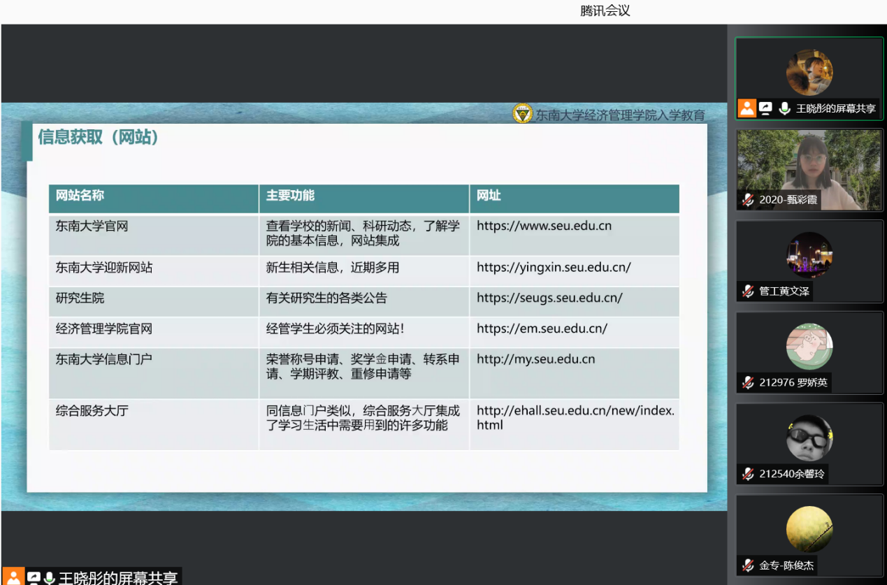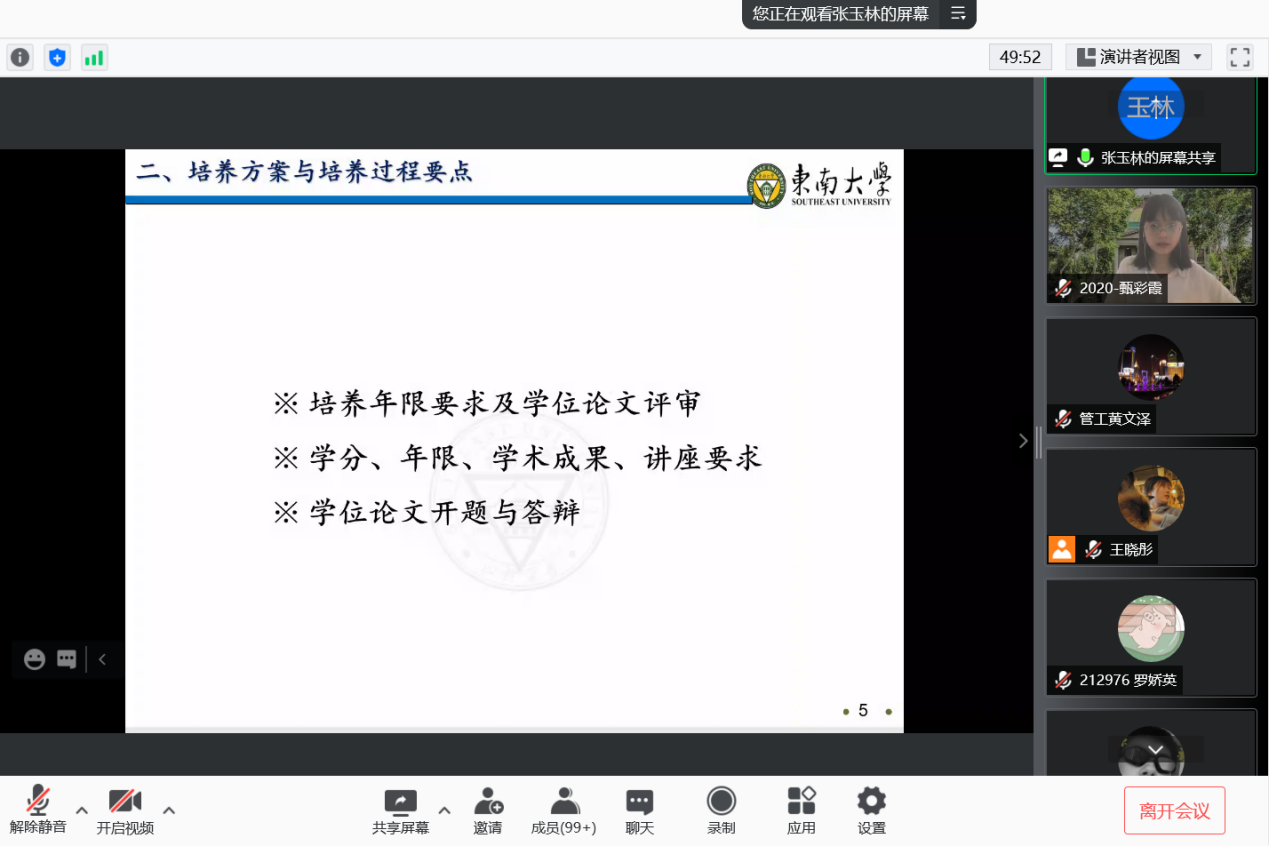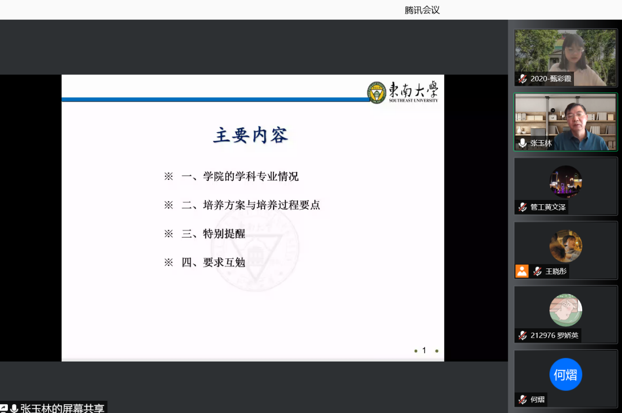 因疫情防控要求,本次会议全程采取线上方式。出席本次入学教育的领导嘉宾有:国产探花 党委副书记兼副院长何熠老师,国产探花 副院长、博士生导师张玉林老师,研究生教务助理杨悦老师、研究生辅导员王晓彤、孙靓、陈丰龙、史雅妮、郑凯戎老师。入学教育由2020级硕士研究生甄彩霞同学主持。