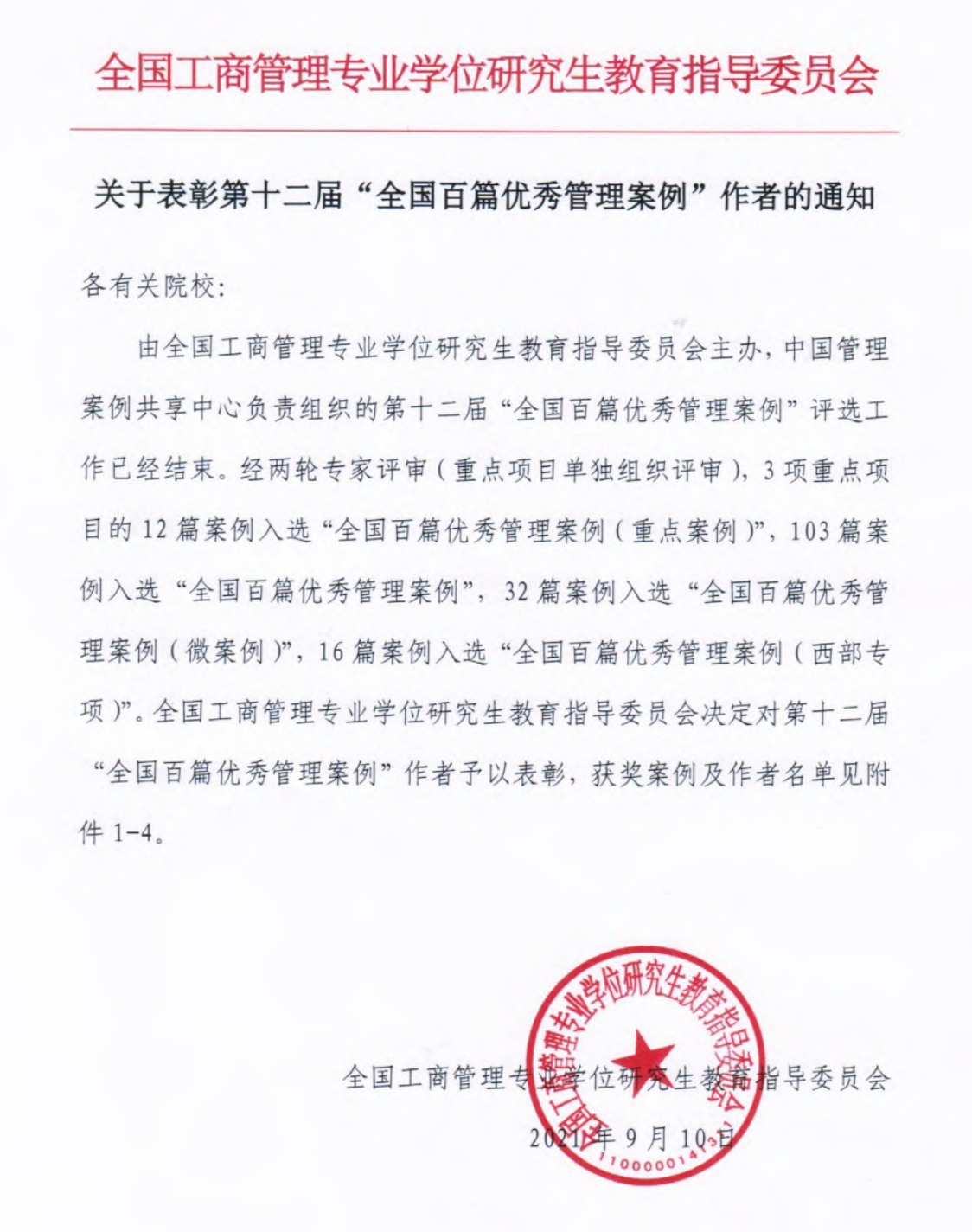 2021年9月10日,由全国工商管理专业学位研究生教育指导委员会主办、中国管理案例共享中心负责组织的第十二届“全国百篇优秀管理案例”评选结果正式揭晓。我校国产探花 本次提交的4篇案例均成功入选“全国百篇优秀管理案例”,创单次“百优”获奖历史新高。