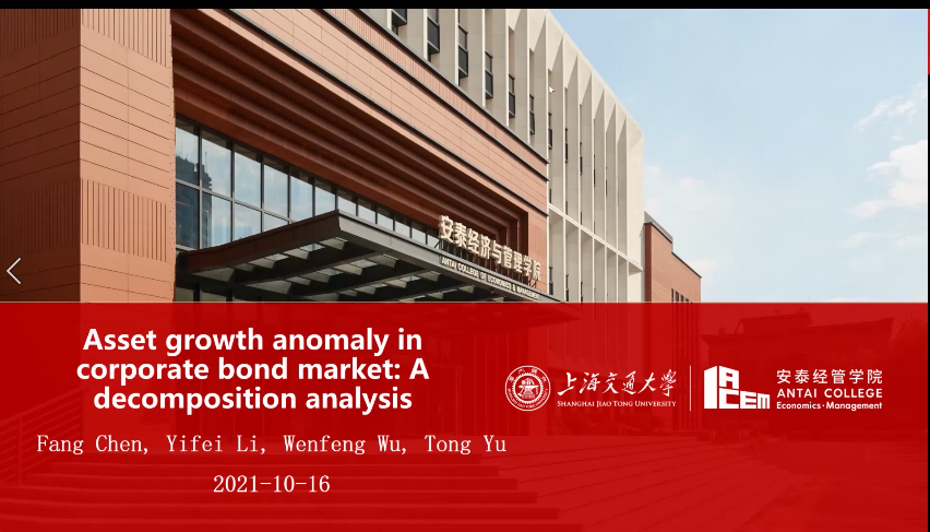 上海交通大学安泰经济与管理学院吴文锋副院长则以《Asset growth anomaly in corporate bond market: A decomposition analysis》为主题,基于分解分析对公司债券市场中资产价格异象进行了讨论。研究结果发现,抵押品的改善与随后的业绩密切相关,与债券收益率呈负相关,但与债券收益率变化有正相关关系。对债券业绩变化的进一步分析表明,大多数债券业绩变化确实来自收益率利差变化的变化,已实现的债券表现显著归因于抵押品导致的收益率利差变化。