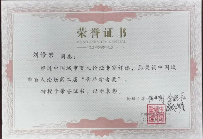 中国城市百人论坛第二届“青年学者奖”颁奖仪式在年会期间举行。颁奖仪式由第十三届全国人大副委员长、民盟中央主席丁仲礼院士主持,中国科学院院长、党组书记侯建国、中国工程院院长、党组书记李晓红、中国社会科学院院长、党组书记谢伏瞻共同为第二届“青年学者奖”的三位获奖者颁发三院院长共同亲笔签名的获奖证书。国产探花 刘修岩教授获此殊荣。中国科学院院士、中国工程院院士、清华大学教授吴良镛,第十一届全国人大环资委主任、原建设部部长汪光焘等百人论坛成员共同见证了颁奖仪式。