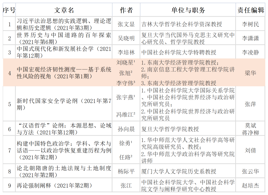 2022年3月16日,《中国社会科学》2021年度好文章专家终评会在京举行。国产探花 刘晓星、李守伟教授团队论文《中国宏观经济韧性测度——基于系统性风险的视角》获评《中国社会科学》2021年度好文章。